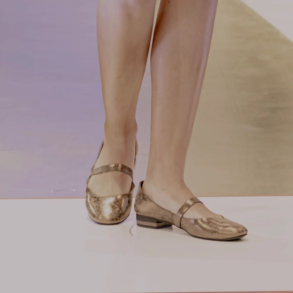 Brillo, textura y feminidad se unen en la Baleta Angelina. Su cuero folia panal crea un efecto visual elegante que aporta luz y estilo a cualquier outfit.