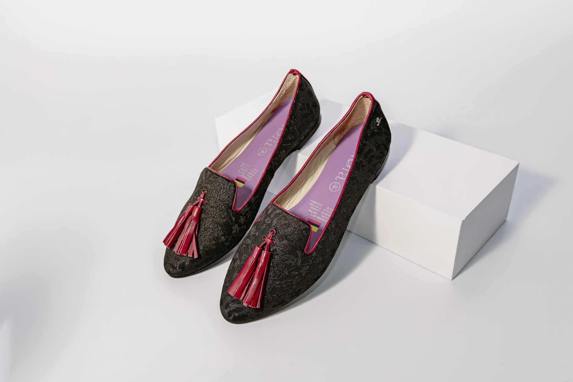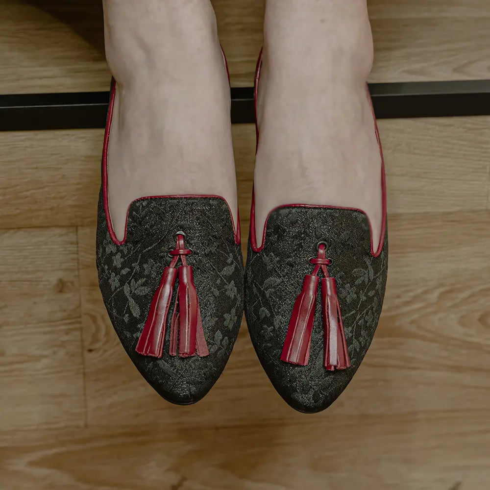Femenino y elegante, el mocasín Rosseta en tejido de flores con flecos personalizables crea un diseño único que destaca en cualquier ocasión.